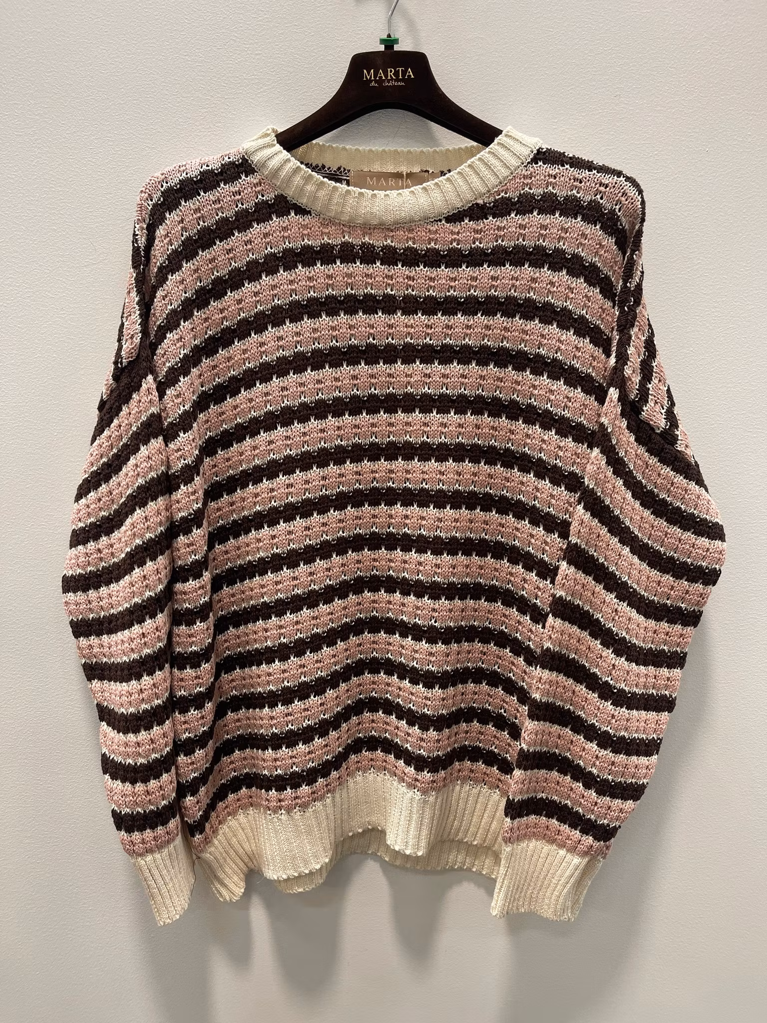 En mjuk och lättburen stickad tröja med klassiskt randigt mönster och avslappnad passform. Den har rund halsringning, långa ärmar och en ledig siluett som gör den både bekväm och enkel att bära.